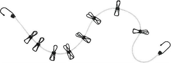 Cestovní elastická šnůra vybavená kovovými háčky a 8 kolíčky na uchycení prádla.