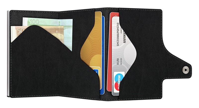 5 + 5 karet (vždy max. 4 embosované + 1 plochá) k dispozici pouhým stisknutím tlačítka (pro správné fungování otvíracího mechanismu je potřeba daný oddíl naplnit 5 kartami). Samostatné otvírání sekce na bankovky a vizitky, kam lze v případě potřeby uložit dalších 6 karet.