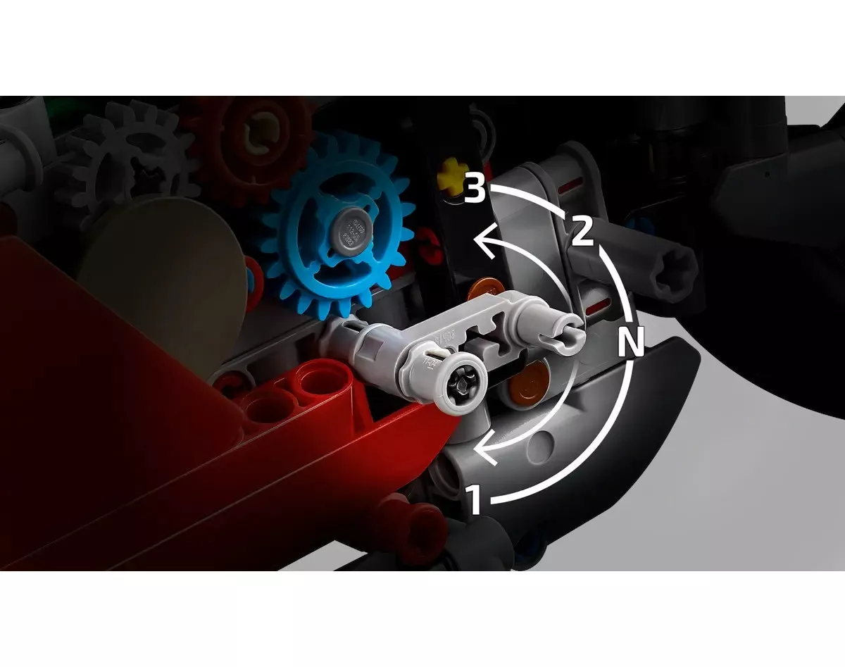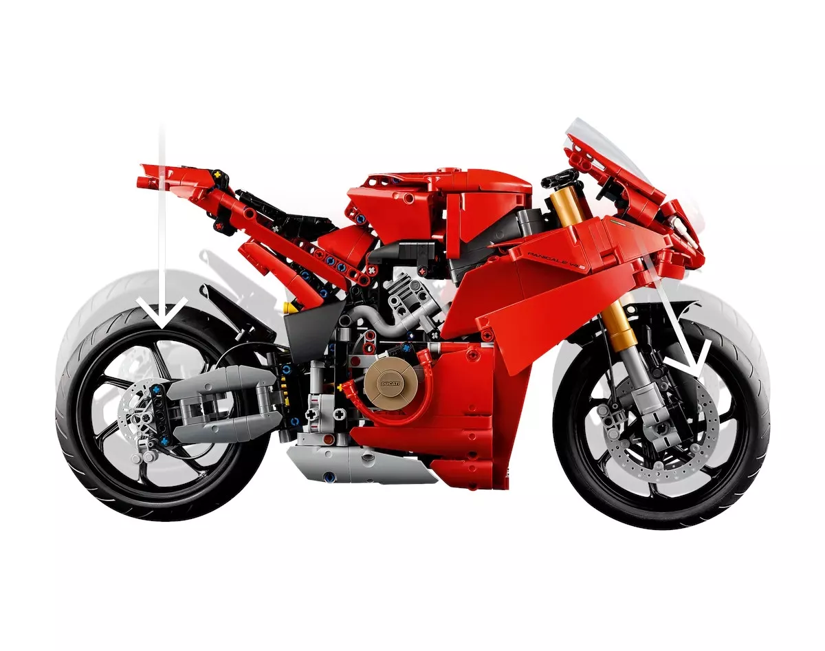 - LEGO Technic Ducati Panigale V4 S je model je nabitý působivými detaily a autentickými prvky, jako je přední a zadní odpružení a řízení