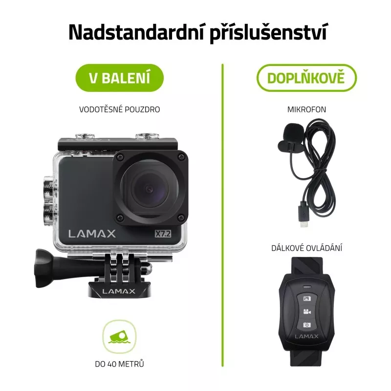 Celý rok, všechny sporty, jakékoliv zážitky. LAMAX X7.2 tě doprovodí na každé cestě. Odolné tělo v parádním LAMAX designu s tebou udrží krok při každé šílenosti. Hoď kameru do pouzdra a potop se až do 40 metrů nebo ji nacvakni na helmu a ukaž všem ranní manšestr na svahu. S rychlou Wi-Fi si svoje záběry přetáhneš klidně rovnou na lanovce.