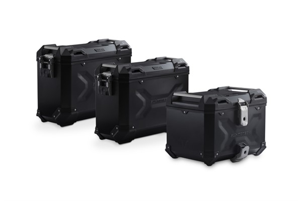 Je to sada tří kufrů TraX Adventure - černé provedení - plus nosiče, zámky, tašky a všeho, co potřebujete pro montáž.