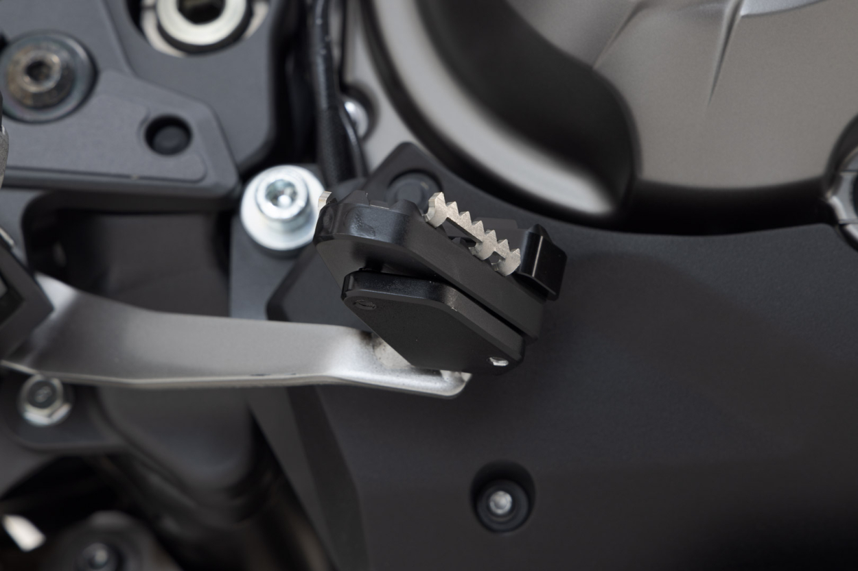 SW-MOTECH vyrábí tyto nástavce z vysokopevnostní frézované hliníkové slitiny; Vyznačují se černě eloxovaným povrchem a schůdkem z nerezové oceli. Pro optimální ergonomické nastavení lze zvýšení kroku brzdového pedálu nastavit ve dvou stupních po 22 nebo 27 milimetrech.