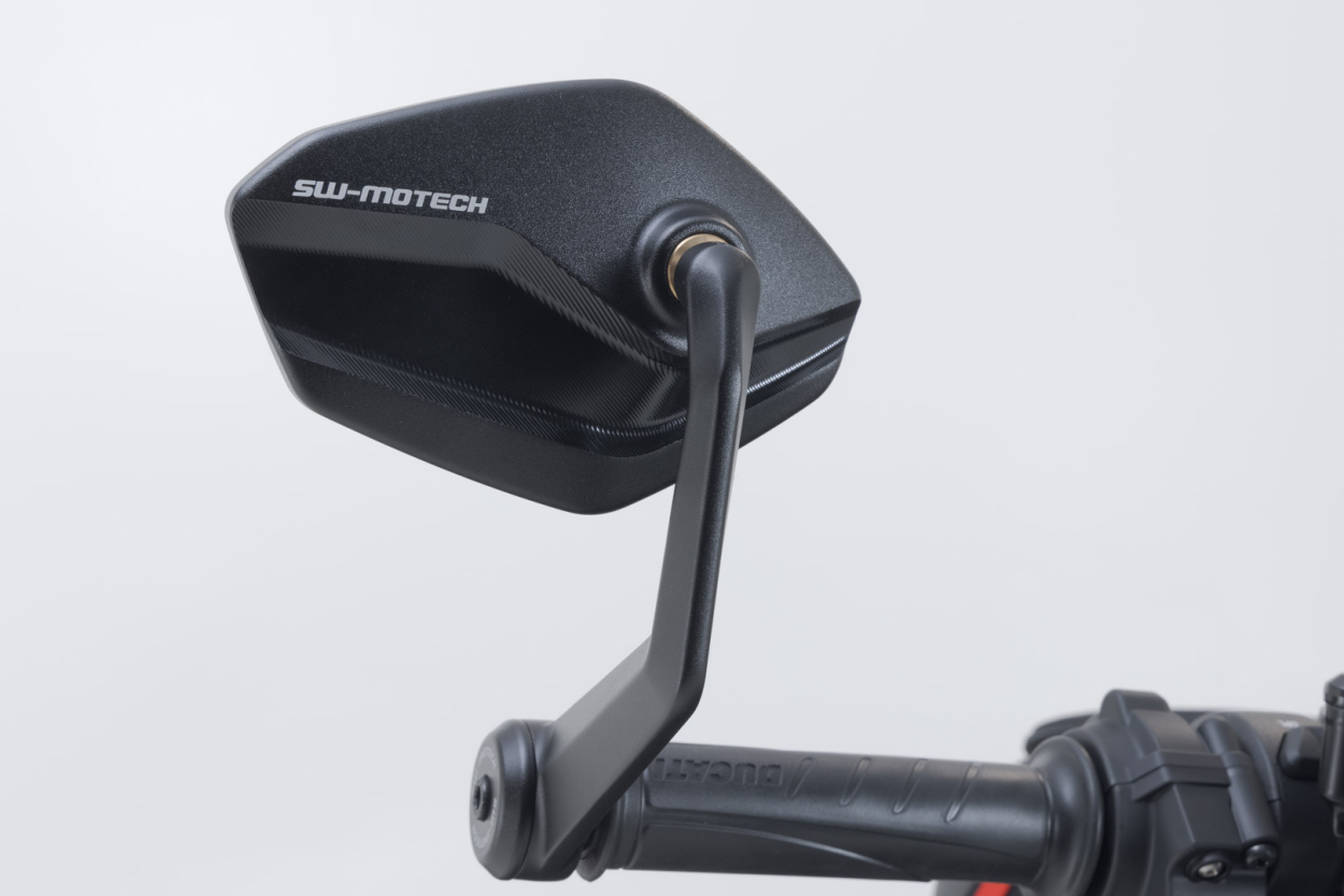 Nechte svůj Ducati Diavel V4 vyniknout pomocí koncových zrcátek na řídítkách od SW-MOTECH. Zrcátka jsou vyrobena z kovaného, frézovaného a černě eloxovaného hliníku a mají vyryté detaily loga. Dodávají tak vašim řídítkům robustní, ale elegantní nádech.