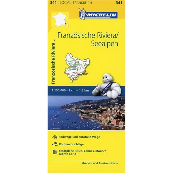 Michelin mapa francouzské riviéry a Přímořských Alp v měřítku 1:150 000. Turisticky velmi vděčná oblast nabízí návštěvníkům jak pláže a starobylá městečka, tak hory.